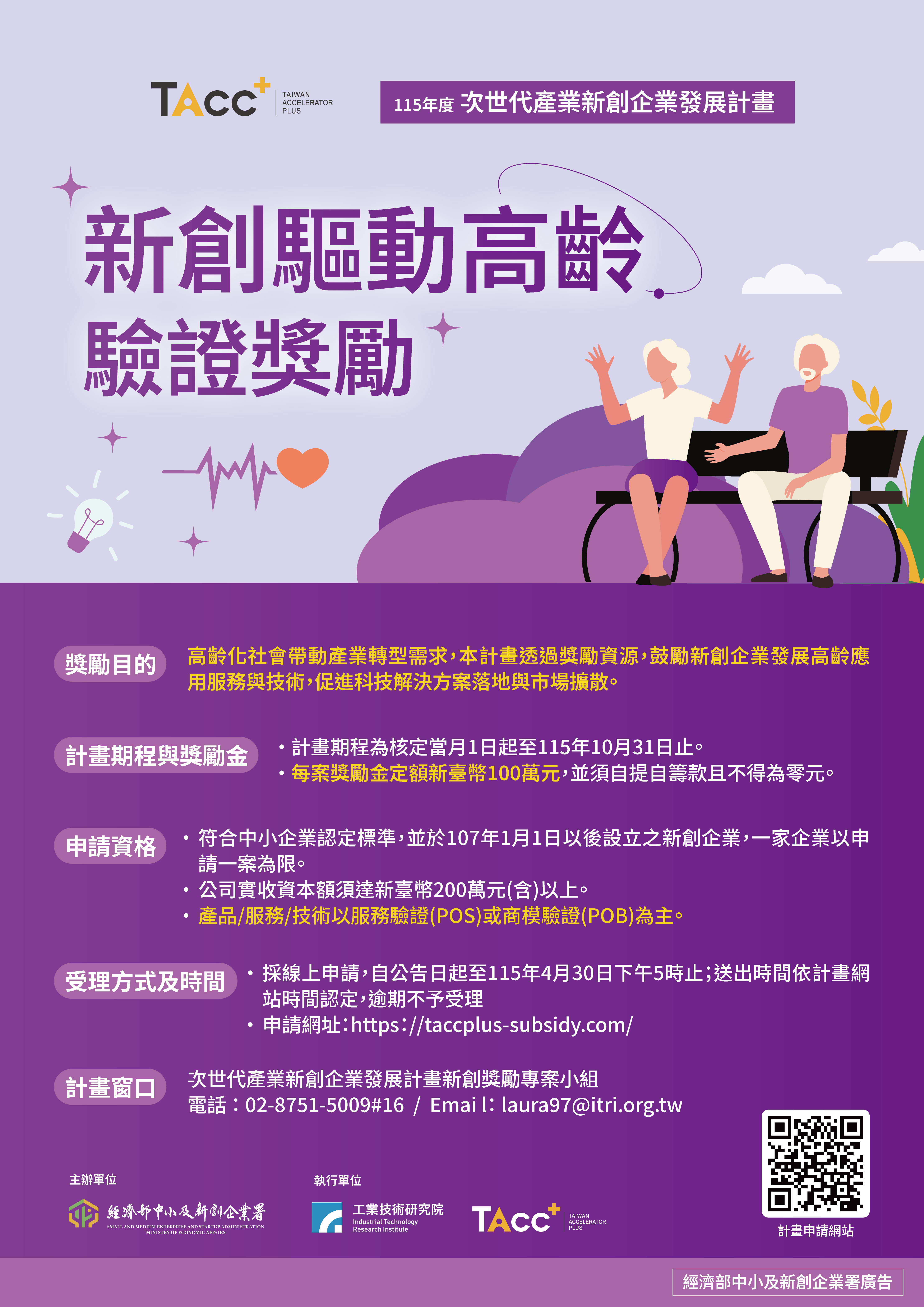 申 請 資 格 (一) 國內依法設立登記之獨資、合夥或公司,並符合下列條件: 1. 符合中小企業認定標準,並於107年1月1日以後設立之新創企業,一家企業以申請一案為限。 2. 公司實收資本額須達新臺幣200萬元(含)以上。 3. 產品/服務/技術須已完成概念驗證(POC),本獎勵計畫以服務驗證(POS)或商模驗證(POB)為主,且能夠提出相關實績說明,例如: (1) 已完成概念驗證(POC)之合作對象或合作項目成果等重要實績。 (2) 服務驗證(POS)或商模驗證(POB)之場域實測規劃、合作金額、目標客群、收費機制等重點。 (二) 有下列情形之一者,不得申請: 1. 曾獲得114年新創驅動高齡驗證獎勵案,或提案內容曾獲得其他政府計畫獎補助者。 2. 於5年內曾有執行政府科技計畫之重大違約紀錄者。 3. 有因執行政府科技計畫受停權處分,且其期間尚未屆滿情事。 4. 於3年內有欠繳應納稅捐情事。 5. 最近3年有嚴重違反環境保護、勞工或食品安全衛生相關法律或身心障礙者權益保障法之相關規定,且情節重大經各中央目的事業主管機關認定之情事。 6. 申請單位及其轉委託單位不得有陸資投資(依經濟部公告之陸資來臺投資事業名錄為準)。 7. 申請單位或其負責人最近三年有涉及訴訟、犯罪情形(包括但不限於詐欺、侵占、內線交易、洗錢與賄賂等)事實經判決確定者。 8. 委外費合作單位或驗證單位不得為關係人(註1)。 9. 公司狀態為解散、撤銷或停業。 申請單位若蓄意隱瞞上列情事,致本署與本計畫執行單位陷於錯誤而完成簽約者,經濟部中小及新創企業署與本計畫執行單位得駁回申請或依職權撤銷獎勵並解除專案契約書之效力,且停止該企業之獎勵申請五年。 註1:關係人係指依「企業會計準則公報第十四號」第五條規定之定義。 (三) 獲獎勵之企業,應於計畫執行期間內完成下列必要查核項目,作為計畫結案之共同達成指標;未依規定辦理者,得依規定辦理限期改善、撤銷或廢止獎勵核定,並得停止撥付次期款及追回其應返還之獎勵經費。 1.完成至少1案因應高齡化需求之服務解決方案,並提交完整成果報告(報告內容應包含核心技術、服務對象、實際應用情境、服務流程、價值主張、場域驗證數據及未來產業應用)。 2.完成高齡相關場域或產業合作,於結案前取得策略性投資、訂單或合約或具商業價值之合作協議(申請單位應依自主設定明確的金額及數量作為結案查核基準)。 3.申請登錄本署社會創新組織資料庫。 (四) 獲獎勵之企業,本計畫提供加速器輔導資源,及商業與技術評估分析建議,並協助其提升營運規劃與計畫執行能力。
